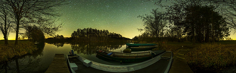 Der Unterspreewald erstreckt sich von Lübben im Süden bis Leipsch im Norden. Das ist keine sehr dunkle Gegend, in der Nähe zu Lübben sogar recht hell, für Astrofotografie grenzwertig. An der Wasserburger Spree liegt dieser kleine Teich zwischen den dunklen Bäumen. Der Standort ist der Steg im See, ringsherum ist Wasser.