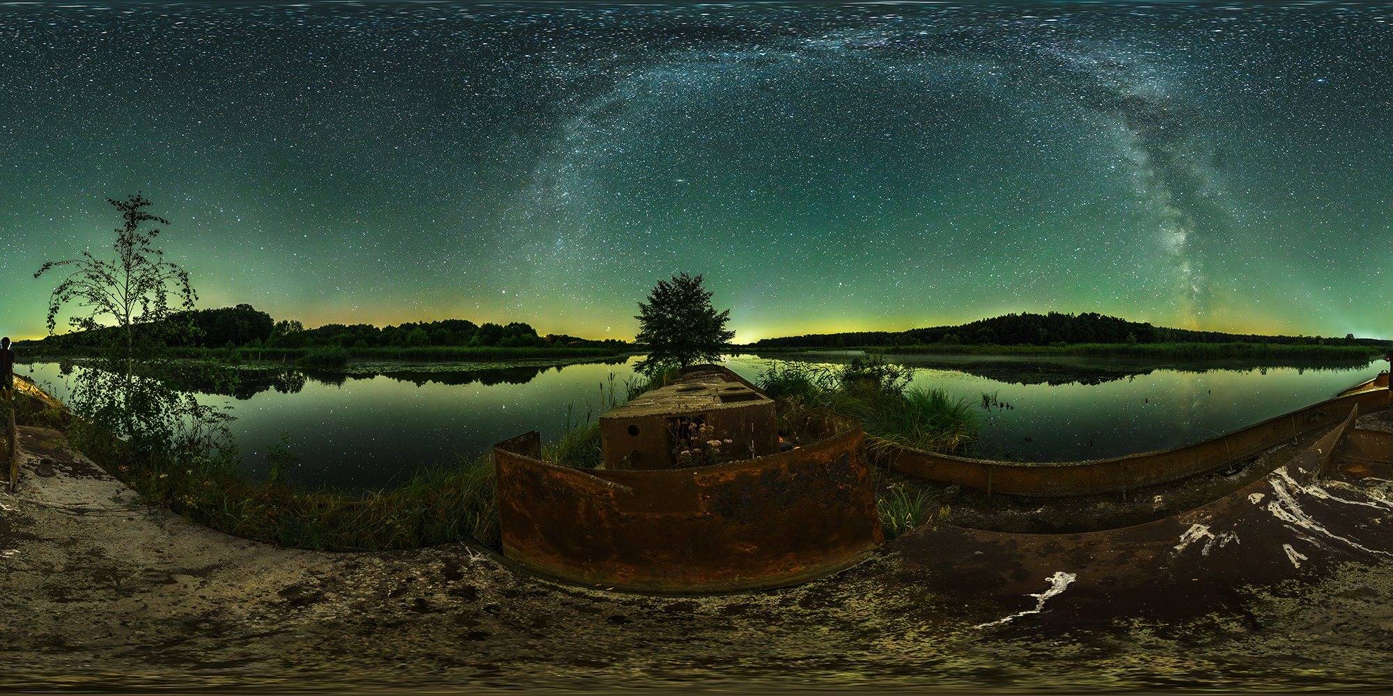 Mitte August um 23 Uhr verdeutlicht die Person im Bild die Dimension des Dampfschleppers. Das Schiff ist leicht mit Lampe aufgehellt, soweit möglich. Obwohl das eigentlich keine ausgesprochen dunkle Gegend ist, stand eine prachtvolle Milchstraße am Himmel. Es war absolut windstill, deshalb gibt eine perfekte Spiegelung der Sterne im Wasser. Fast so, als ob das Schiff im All schweben würde.